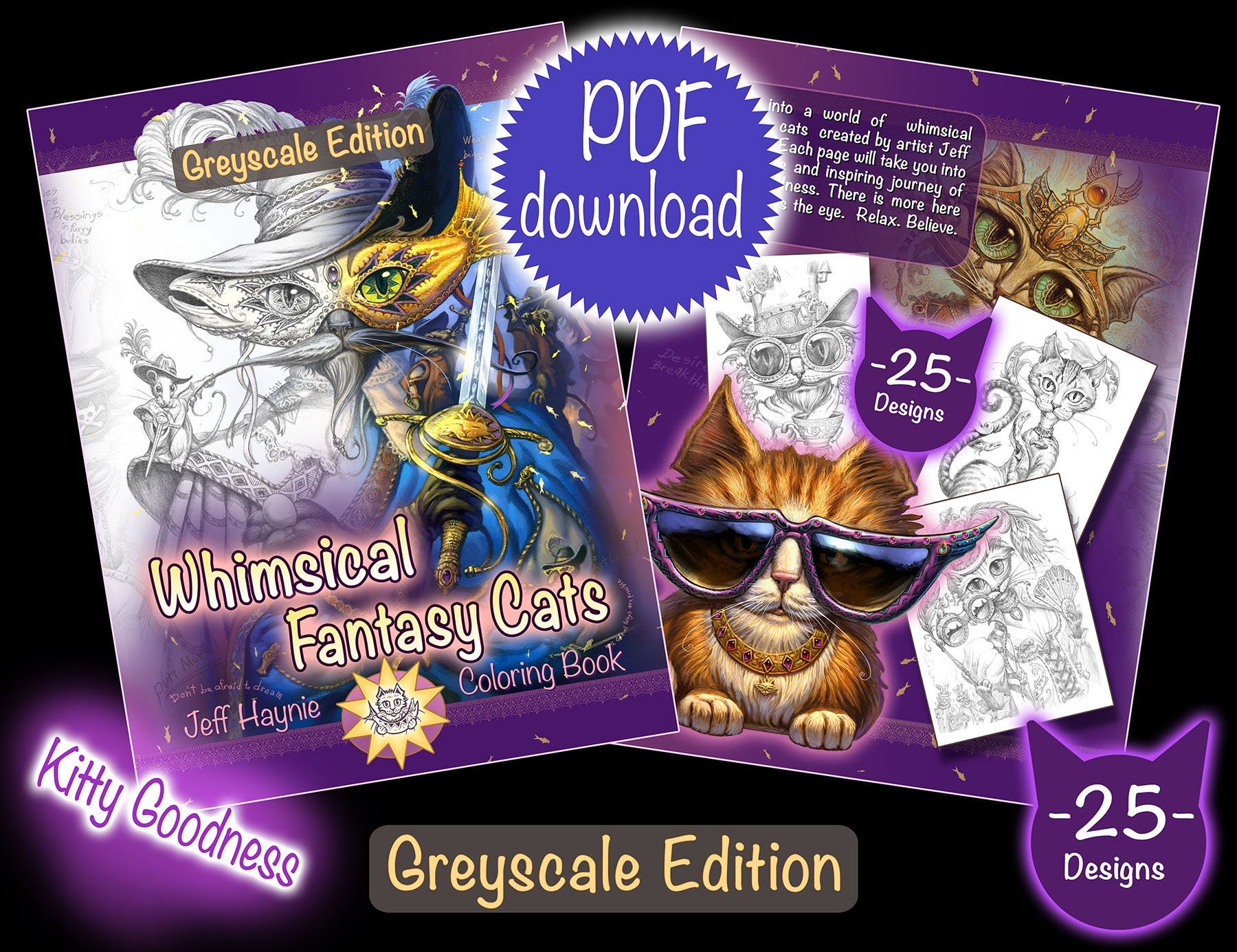 Digital Download, Whimsical Fantasy Cats Coloring Book - GRAYSCALE VERSION